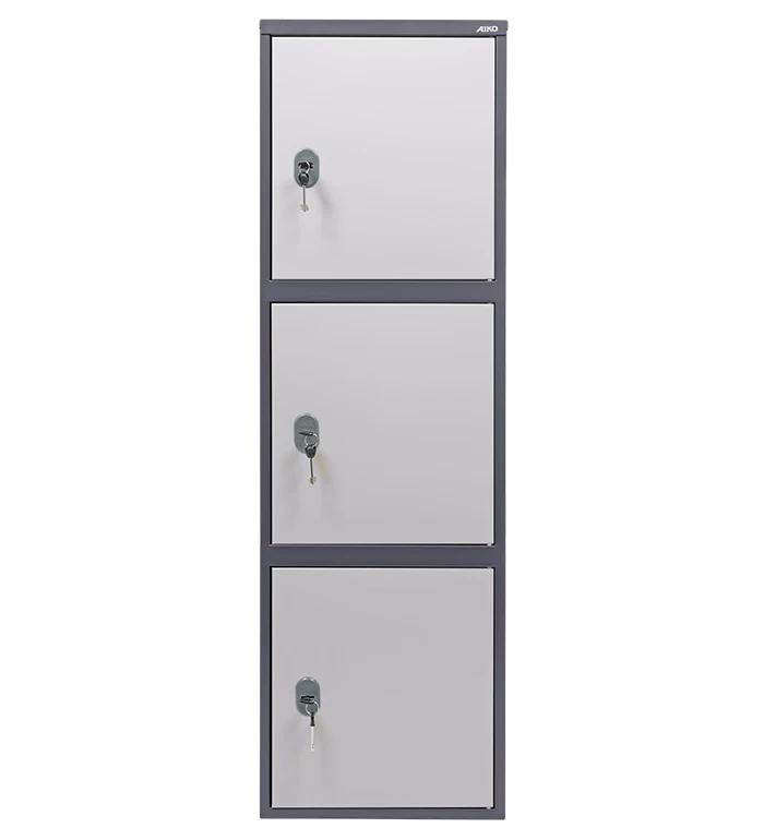 Шкаф Aiko SL-150/3Т – это прочное сварное изделие из стальных листов толщиной 1.2 мм. Состоит из трёх секций: в двух нижних имеются съёмные полки, а в верхней – кассовое отделение (трейзер) со своим замком. Полки можно передвигать по высоте с шагом 90 мм, позволяя распределить объём шкафа самым рациональным образом.